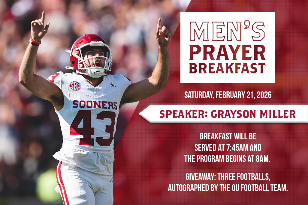 Join us for our Men’s Prayer Breakfast on Saturday, February 21, featuring Grayson Miller, standout punter for the University of Oklahoma football team.